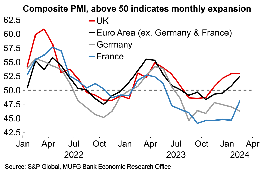- There will also be a range of survey indicators for March released next week. The euro area PMIs have pointed to a two-speed economy at the start of 2024 – with activity in Germany and (to a lesser extent) France lagging behind peripheral countries. We expect slightly better news in the flash March figures as growth conditions continue to improve.