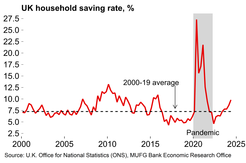 Despite that, we continue to expect that consumer conditions will remain supportive. Today’s GDP numbers were encouraging with consumer spending picking up from 0.2% to 0.5%. Private sector real pay growth averages a very healthy 2.8% Y/Y in 2024. We see that falling to around 1.5% next year but that would still be close to the pre-pandemic (2015-19) average of 1.3%.