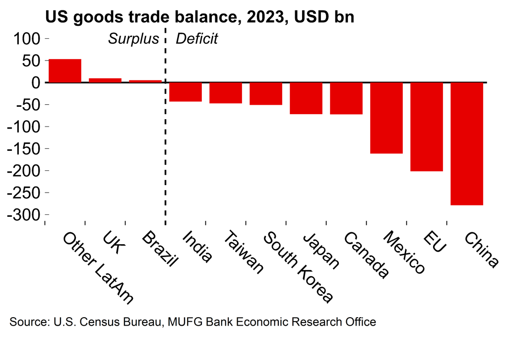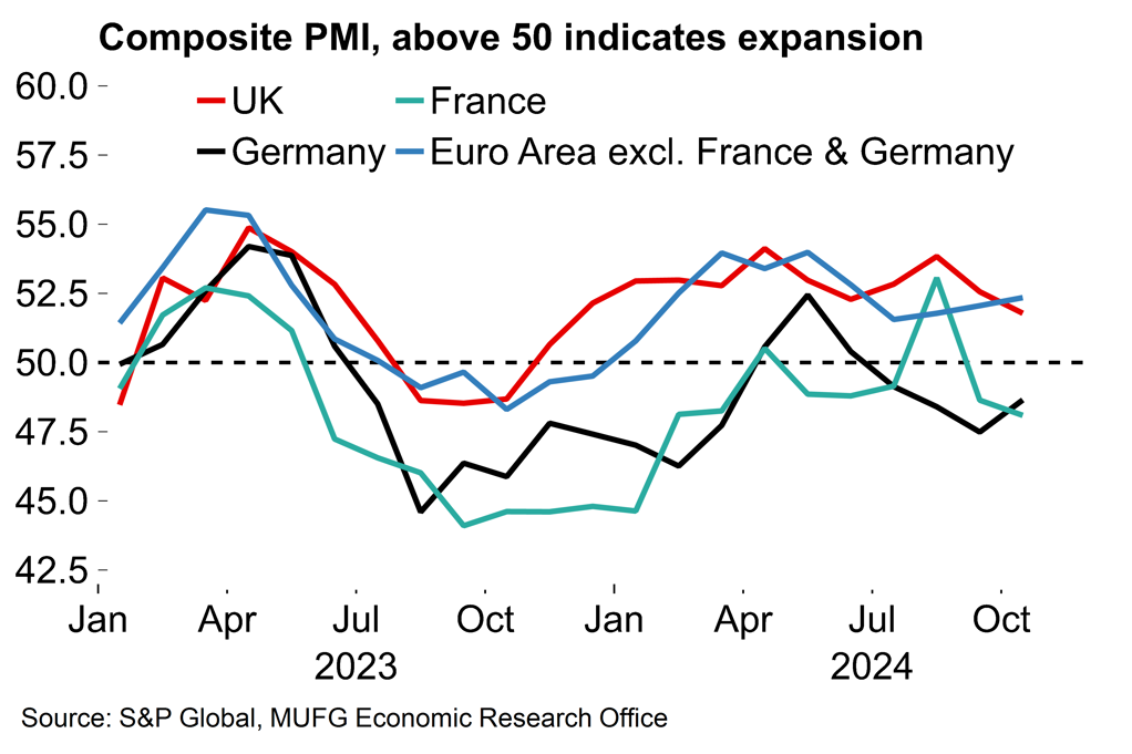 The UK also looks less exposed to any post-election increase in US protectionism. It is unclear to what extent Trump’s campaign rhetoric will translate into actual policy, but our current base case is that the UK will avoid new US tariffs next year. Trump has previously placed a lot of significance on the US goods trade balance with other economies. The US has a goods surplus with the UK and so we see the UK being low on the target list for new tariff measures. It is certainly plausible that the EU could face some targeted measures but not the UK, in what would be a Brexit benefit.