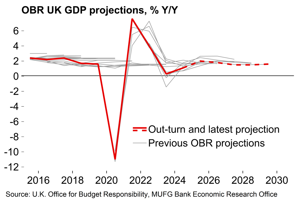 Our central scenario sees UK growth at 1.6% in 2025. That’s below the OBR’s post-Budget figure of 2%. While we’re not quite there, we would note that the OBR has a track record of over-optimism on UK growth (Chart 3) and we still consider our broad view on the UK economy to be positive. Despite recent (and perhaps upcoming) survey weakness, we expect the mood music to improve as noise around Budget measures fade and the government proceeds with its front-loaded spending plans. We also see better conditions for business investment from a more stable political environment and believe that consumers will become less cautious over coming quarters.