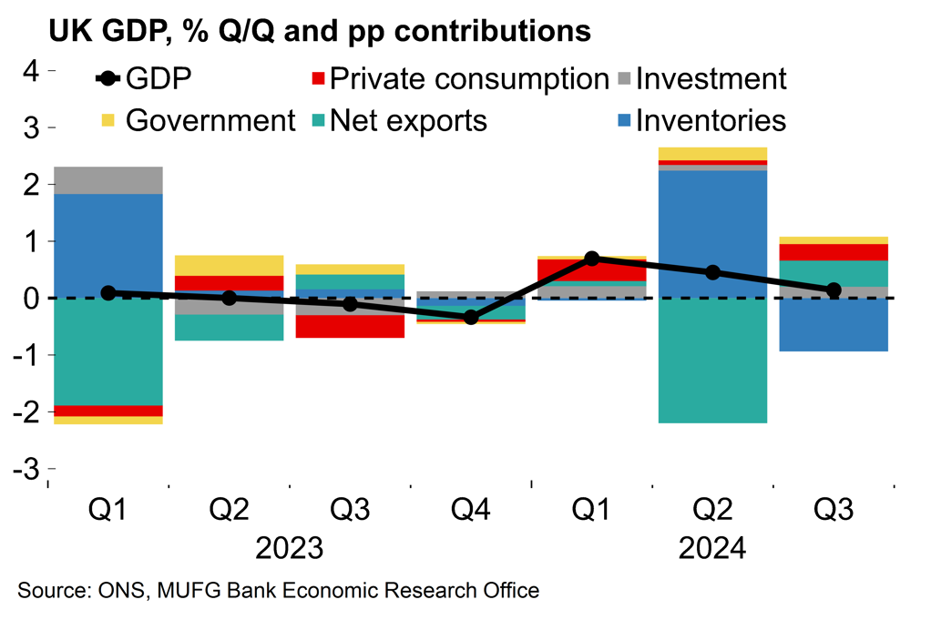 However, the details are more encouraging than the headline growth figure. The volatile inventories component was the only drag. Household consumption expanded by a healthy 0.5%, up from 0.2% previously, in a sign that the recovery in real incomes may now be boosting activity more reliably. Business investment also continues to recover from the extended period of post-Brexit stagnation: it was up 1.2% on the quarter and 4.5% on the year. This all points to reasonable underlying momentum and we expect a growth rebound in Q4, but note that the slew of data next week (retail sales, consumer confidence, flash PMIs) will give a good indication of the initial Budget effect on sentiment and activity.