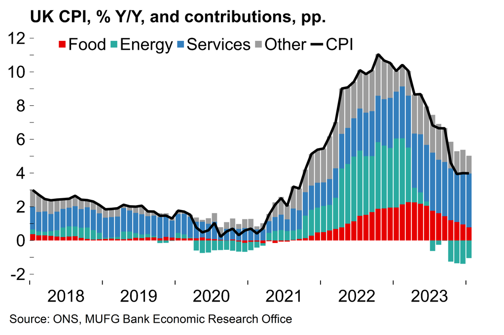 Looking ahead, we expect that UK inflation will edge lower in coming months before falling more meaningfully from April. Lower wholesale gas prices point to a significant fall in household energy prices of around 15% (the announcement is next week) from Q2 under the UK’s energy price cap system. As it stands, another reduction in July also looks likely. Meanwhile, food inflation continued its downward slide, falling to 7% from a peak of around 20% in March last year. Input price data suggests that this trend of food price disinflation will continue through 2024 and food prices could soon drag on the headline rate.