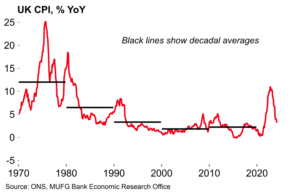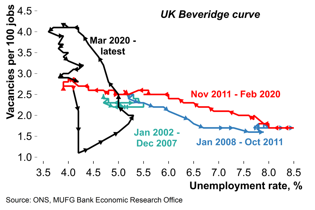 Nonetheless, developments across the Atlantic cannot be ignored – sterling weakness as a result of divergence with the Fed would have a positive effect on UK inflation through higher import prices. The UK has relatively recent experience of this: the sterling shock following the Brexit referendum pushed headline inflation up to 3.1% in late 2017 (after the recent inflation surge, context is important – the 2014-16 average rate was just 0.7%).