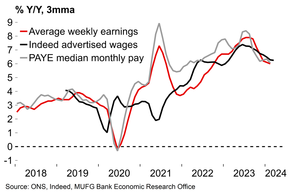 The labour market data also showed broad pay strength, with the annual growth in regular earnings (ex. bonuses) at 6.0% in the three months to February (cons: 5.8%). There were few signs that firms had pre-empted the 10% rise in the UK minimum wage from April, with pay growth in the distribution, hotel and restaurant sector, which is most sensitive to minimum wage regulation, slowing slightly. From a monetary policy perspective there was better news in the form of the slightly timelier PAYE measure which showed pay growth slowed to 5.6% in March from 6.2% in February. But it does now look as though private sector regular wage growth will slightly overshoot the BoE’s projection of 5.7% in Q1.