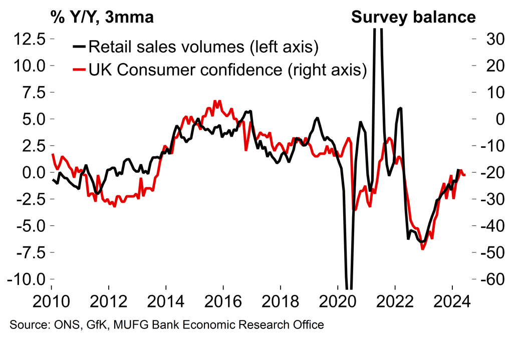 Last week we noted that the UK economy has almost certainly exited recession at the start of 2024 (see here) – but these numbers underscore that the recovery is likely to relatively muted. We continue to track Q1 GDP at 0.3% Q/Q, and expect similar growth rates through the rest of the year. Some actual, sustained growth would be welcome news after an extend period of what has essentially been stagnation for the UK economy. But, while consumer spending is set to steadily become a more reliable growth engine, overall activity growth is likely to be tempered by the lagged effects of monetary policy tightening.
