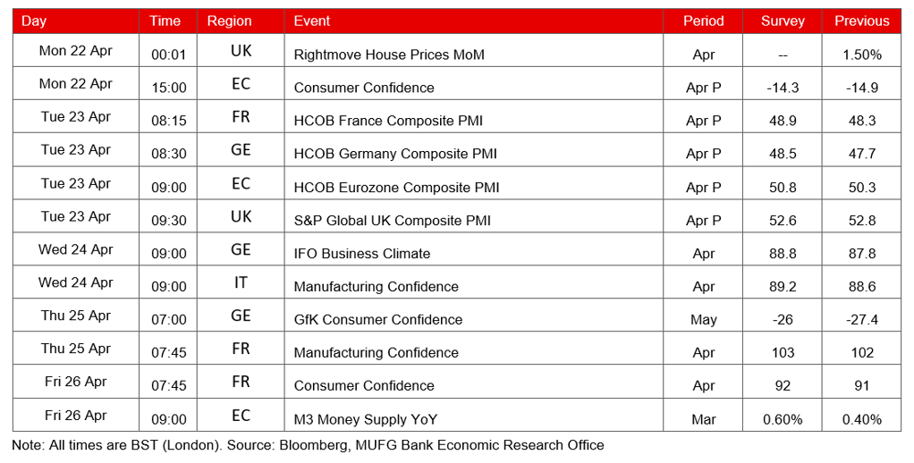 - Next week attention will be on a slew of survey data. Overall we expect to see further signs of improving momentum in the European economy at the start of Q2.