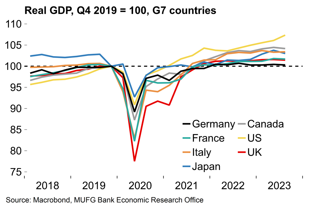 It was estimated that GDP fell by 0.3% Q/Q in Q4. The Q3 number was revised up from -0.1% to no growth (0.0%). For what it’s worth, this means that the German economy may have just about avoided slipping into a technical recession (the official national accounts data for Q4 will be released on 30 January). However, the bigger picture remains the same: the German economy has clearly stagnated. GDP has increased by just 0.7% since 2019 as higher interest rates, energy costs and weaker foreign demand have weighed on activity. Germany is clearly at the back of the pack when it comes to the post-pandemic economic recovery in G7 economies (Chart 3).