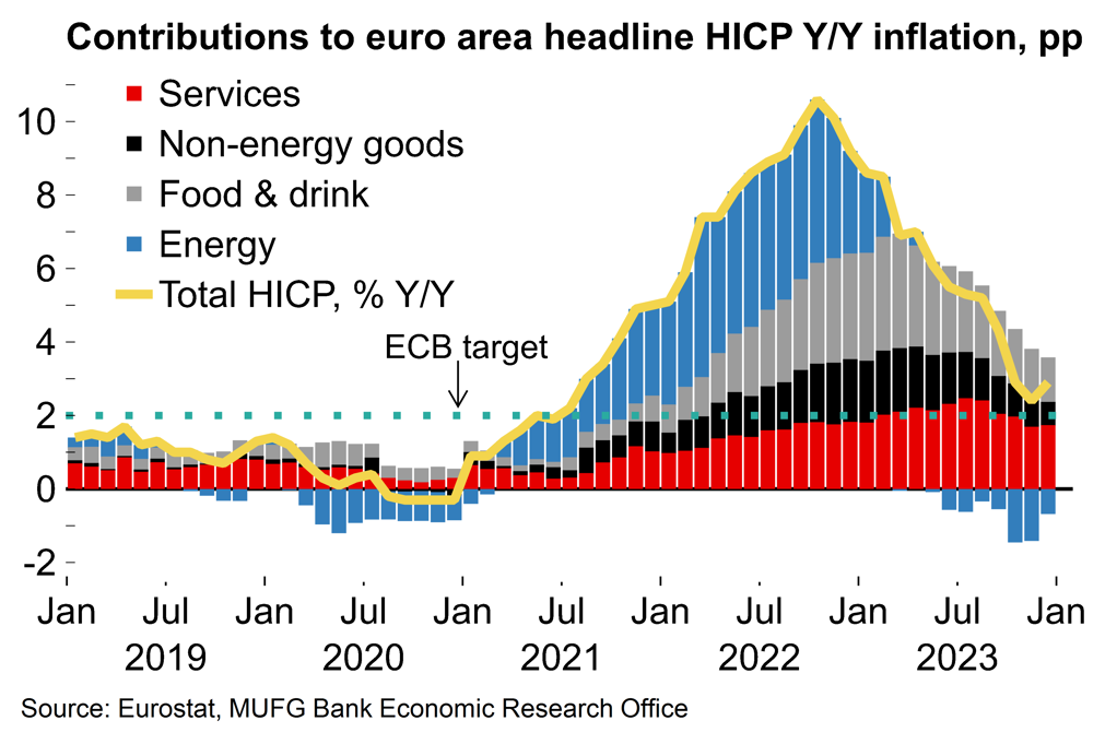 That may be a tough ask against the clear trend of disinflation last year and a sluggish euro area economy. Yes, headline inflation edged up in December (Chart 5), but we think that was just a blip (see here). We also expect confirmation that the euro area economy has slipped into technical recession when the Q4 national accounts are released at the end of this month. Against that background, holding off on rate cuts until the summer will be a communication challenge for the ECB – not least because the official HICP projections will likely be revised lower at the next update in March on the back of lower energy costs and ongoing easing in underlying inflation pressures.