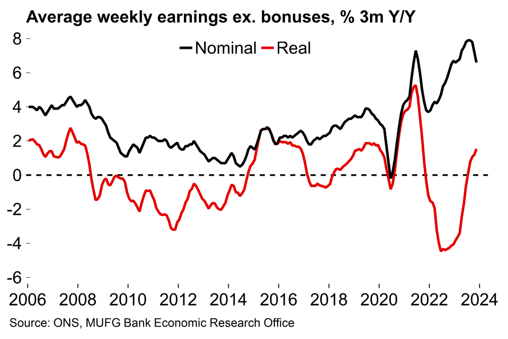 Meanwhile, official wage growth has fallen but remains uncomfortably high from a monetary policy perspective at 6.6% (ex. bonuses, 3M Y/Y) in November (Chart 2). The timelier PAYE estimate for December suggested that total pay growth may have edged up at the end of the year, and we know that the UK minimum wage will increase by 9.8% from April. We also expect some tax cuts in the Spring Budget on 6 March ahead of the upcoming UK election – which would see fiscal and monetary policy pulling in opposite directions. Against that background, the BoE may be reluctant to make a dovish pivot much before its May policy meeting. Markets are currently pricing in around four and a half rate cuts in 2024.