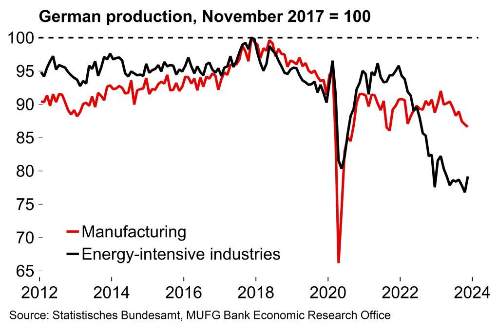 We expect some improvement in growth in 2024, especially in H2. Consumer spending should benefit from a recovery in real household income growth as the disinflation process continues. Business confidence is likely to benefit from lower interest rates (the ZEW expectations gauge increased in January on the back of strengthening expectations for ECB rate cuts). However, structural challenges for the industrial sector (Chart 4) are likely to persist (see here) and external demand is unlikely to surge higher. Our current forecast is for annual average growth of 0.6% in 2024. We will likely revise this lower at our next forecast update if Q4 GDP is confirmed at -0.3% Q/Q due to the likely negative carry-over effect.