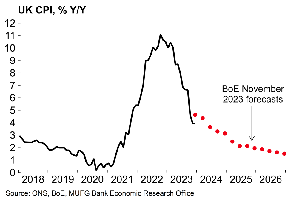 In terms of policy implications, the Q4 average CPI rate of 4.2% easily undershoots the BoE November forecast (4.6%). A sizeable downgrade to the BoE’s headline CPI projection in the February update is therefore likely (Chart 1). There’s also evidence that underlying price growth is easing: our seasonally-adjusted core rate edged down to 2.3% on a 3m/3m annualised basis. That said, the BoE will still be wary about the possibility of sticky services inflation. Many mobile and broadband contracts will increase in April by the December rate of CPI plus 3.9pp (i.e. 7.9%).
