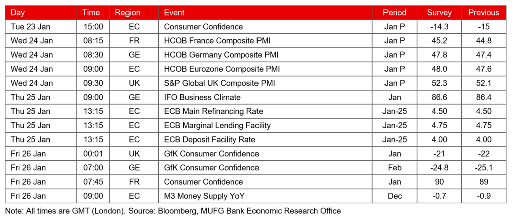 - Next week the focus will be on the ECB policy meeting. Recently officials have been attempting to push back against market expectations for rate cuts early this year. With the euro area close to technical recession and inflation set to ease in coming months this may become an increasing tough task.