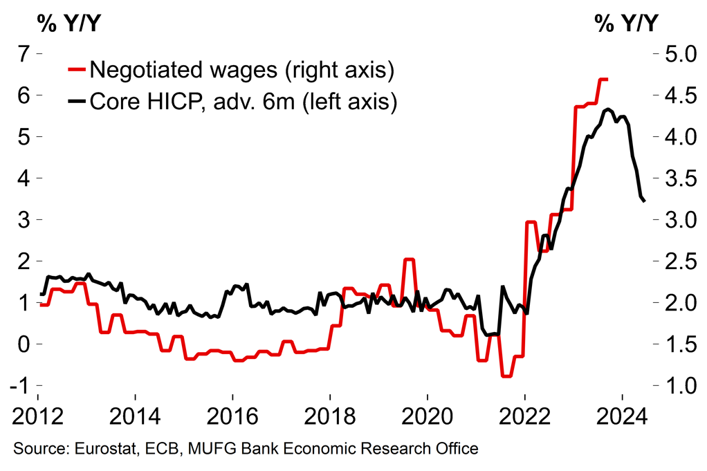 Based on Lane’s interview, it seems as though policymakers will lean on the fact that wage growth is still high as a reason to hold off declaring victory over inflation for a while yet. There are credible reasons to be cautious: the euro area unemployment rate fell to an all-time low of 6.4% in November with sluggish demand not yet translating into clear labour market loosening. The euro area wage tracker from Indeed, the jobs board, also edged higher in December to 3.9% Y/Y. This is not that inconsistent with the ECB’s inflation target with reasonable productivity growth assumptions, and the general trend remains downwards. We’d also highlight that wage growth is a lagging indicator when it comes to inflation (Chart 6). But the bottom line is that the ECB is wary of second-round effects from wage growth on inflation – or at least wants to seem that way to avoid loosening financial conditions – and does not yet seem ready for a dovish pivot of the sort seen from the Fed in December.