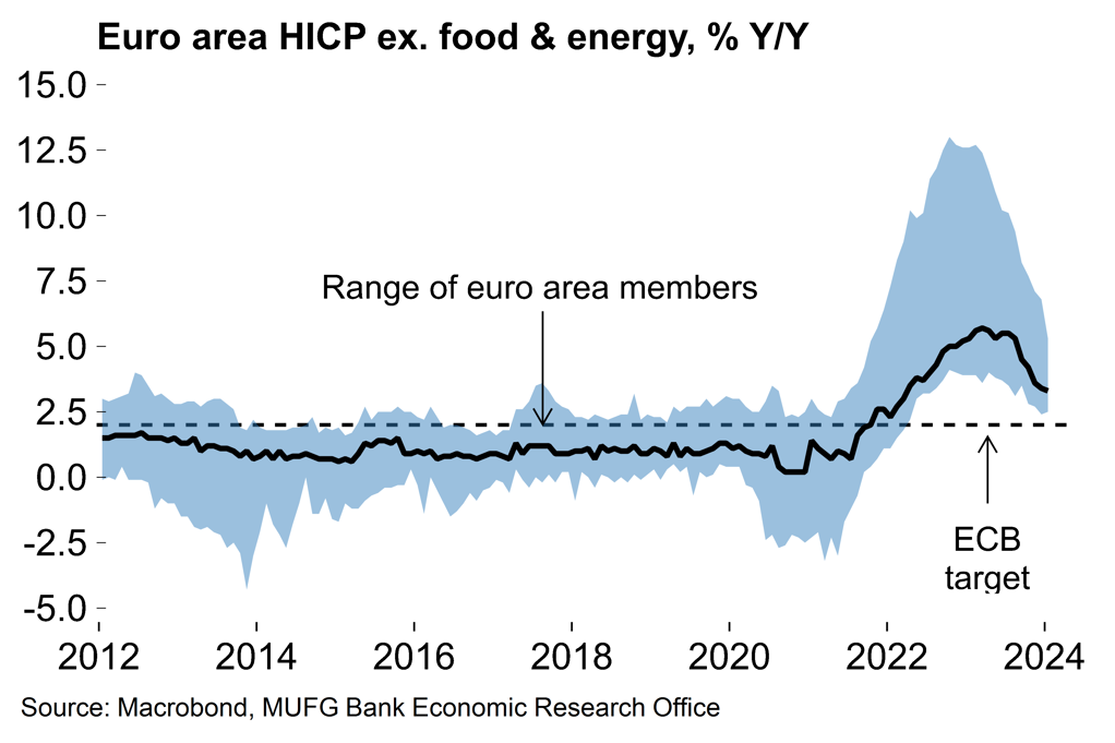After rising to 2.9% Y/Y in December, euro area headline inflation edged down again to 2.8% in the flash release for January. This was slightly above the consensus expectation. Core inflation also declined by 10bp, to 3.3%, although the services component remained unchanged at 4.0%. Food price inflation was also a little higher than expected given the ongoing fall in producer prices.