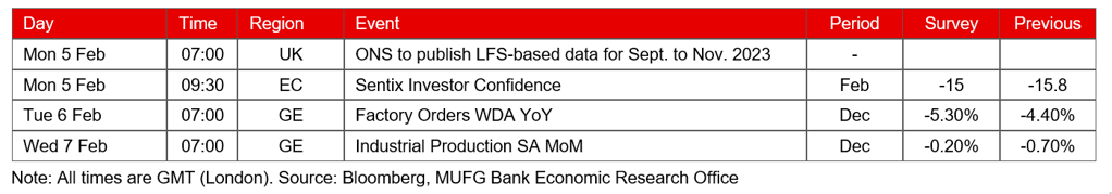 Next week looks light on the data front after a busy period of central bank meetings, inflation readings and national accounts releases. We know the German economy struggled in Q4 (GDP contracted by 0.3% Q/Q) but German factory orders and industrial production will give some clues as to how much momentum the beleaguered manufacturing sector had going into 2024. Aside from the downward move in wholesale gas prices over the last few months, there’s been very little good news in recent times (see here).