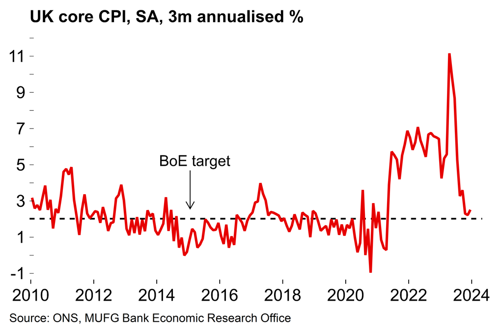 However, the projection for inflation to fall back to target temporarily suggests that the window for the initial rate cut could be narrow. Embarking on an easing cycle when headline inflation is rising again later in the year, as the BoE expects, would pose a communication challenge. The means that the current market pricing for the first cut in May or June looks appropriate to our minds, although there may still be concerns by some on the MPC over the persistence of underlying inflation pressures.