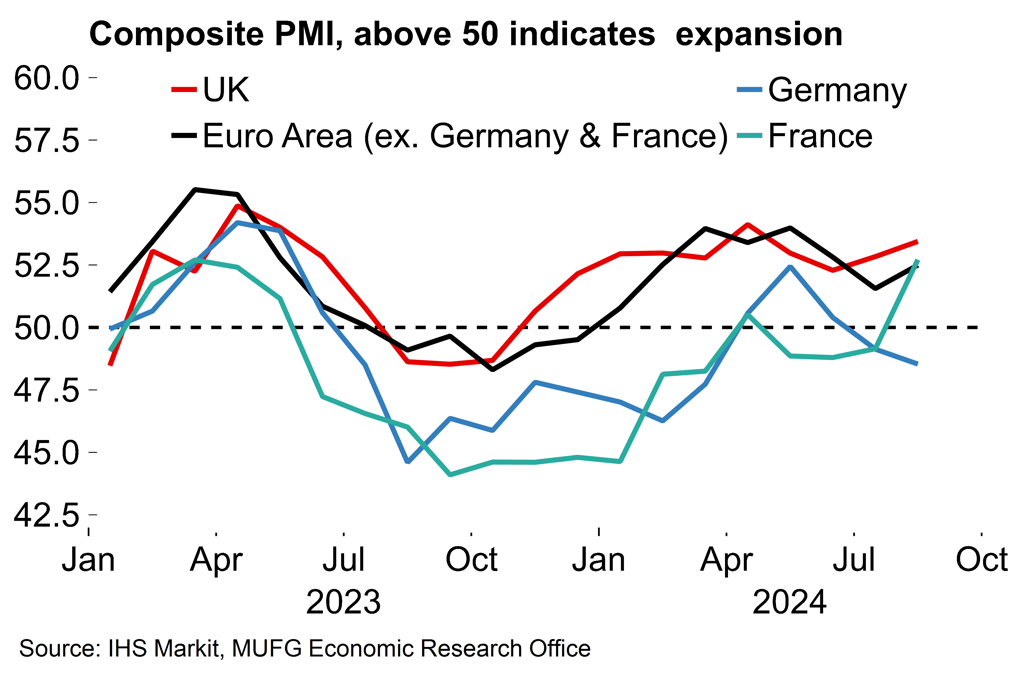- The flash PMIs for August did little to ease concerns about a slowing euro area economy. A temporary boost to French services from the Olympics helped to bolster the headline number but gloomy news continues to emerge out of Germany. The euro area’s largest economy is clearly struggling and there are few signs of any imminent turnaround in fortunes. Risks around our growth outlook for the euro area as a whole (0.7% in 2024) are tilted to the downside.