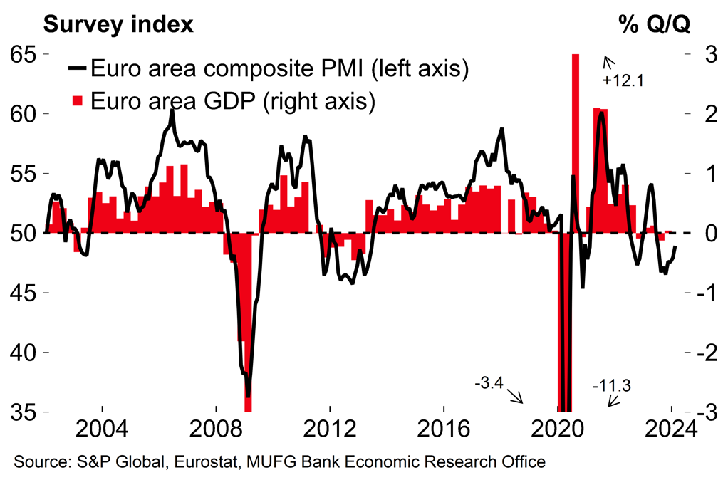 The UK composite PMI continued to increase in February and now stands at a healthy 53.3. Forward-looking components also improved, suggesting that momentum should remain firm. The survey is consistent with GDP growth of around 0.25% in Q1 this year. However, the PMI doesn’t cover the retail or government sectors. These were key areas of weakness behind the 0.3% GDP contraction in Q4 2023 and both have scope to rebound this quarter, so risks to that figure could be on the upside. Our view remains that the UK’s technical recession is likely to be mild and short-lived.