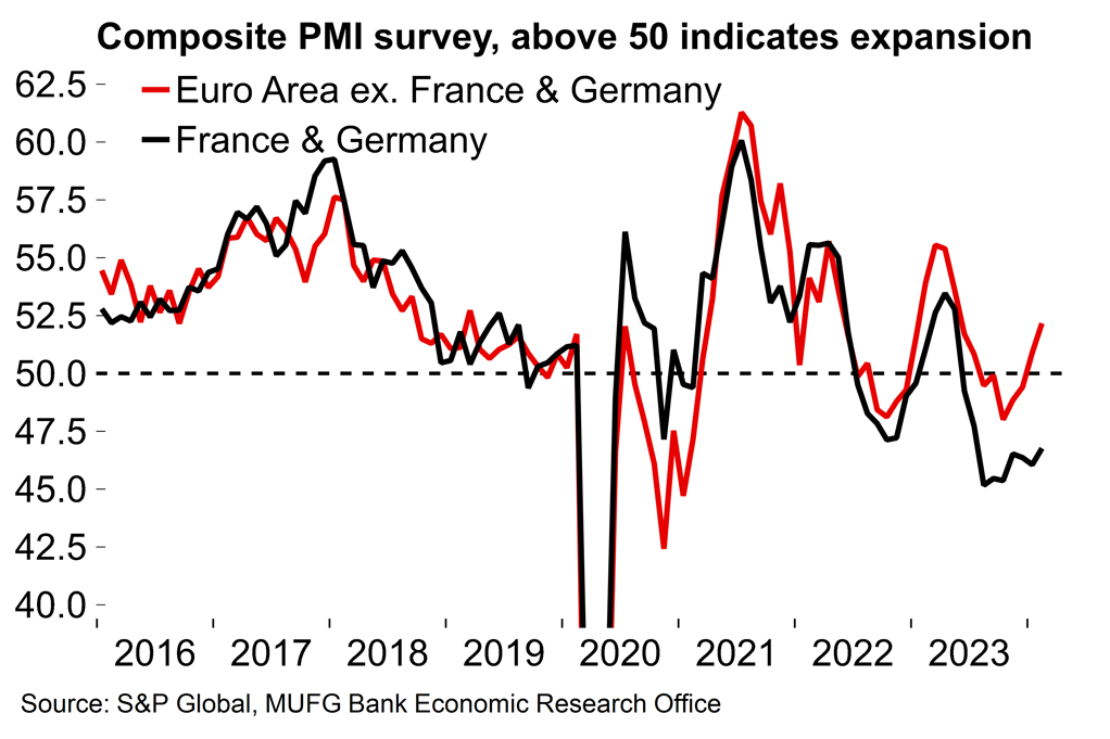 On the other hand, the PMI release also showed that output price pressures in the services sector have risen continuously since last October. That may cause some consternation among policymakers at the ECB, with pay pressures now the key obstacle to inflation returning sustainably to target.