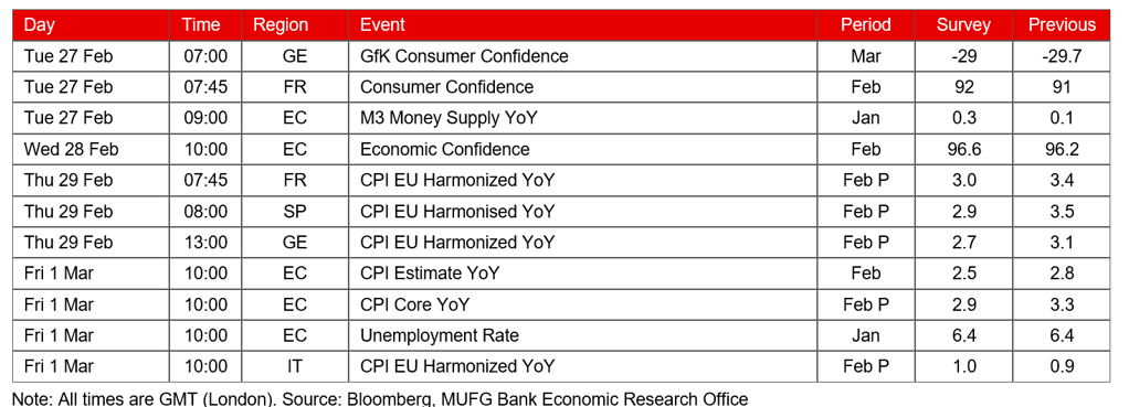 The focus next week will be euro area inflation in February. The flash release is likely to show that the disinflation trend has resumed after a temporary hiccup around the turn of the year relating to base effects in the services sector. We expect both headline and core rates will fall. There will also be data on euro area money supply, unemployment rate and the European Commission’s economic sentiment survey released next week.