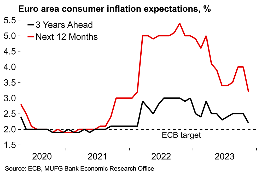 After a concerted effort from senior ECB officials to steer expectations away from earlier rate cuts in recent weeks (see here) there was less pushback at the meeting itself than we had expected. With the euro area unemployment rate at an all-time low, the ECB could have leant more on labour market tightness as a reason to worry about persistent pay pressures. As it was, President Lagarde acknowledged that the Indeed wage tracker – one of the timeliest indicators of pay growth – seems to have peaked (Chart 3). She also noted that measures of inflation expectations “have come down markedly” (Chart 4). There wasn’t much made of the effect on shipping costs on inflation following recent geopolitical tensions, either.