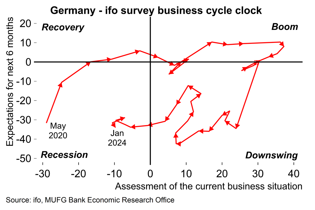 By country, the composite PMI figures for both Germany and France both weakened. The euro area aggregate that excludes these two countries is now back into expansion territory at 50.9 (Chart 1), with core euro area economies continuing to find it relatively tough going. Indeed, the German ifo survey, normally a reliable growth indicator, deteriorated in January (Chart 2). The German economy likely contracted in Q4 last year and, as yet, there are few indications that momentum has improved in 2024.