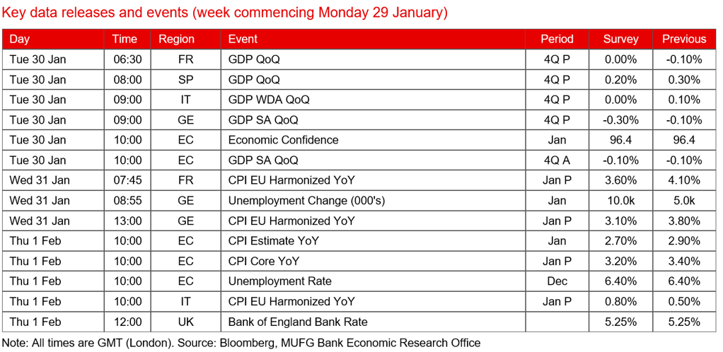 - A range of key data will also be released next week. We expect to see that the euro area economy slipped into a mild technical recession in H2 2023 – but the overall picture is one of stagnation rather than crisis. Meanwhile, euro area inflation probably resumed its downward path in January.