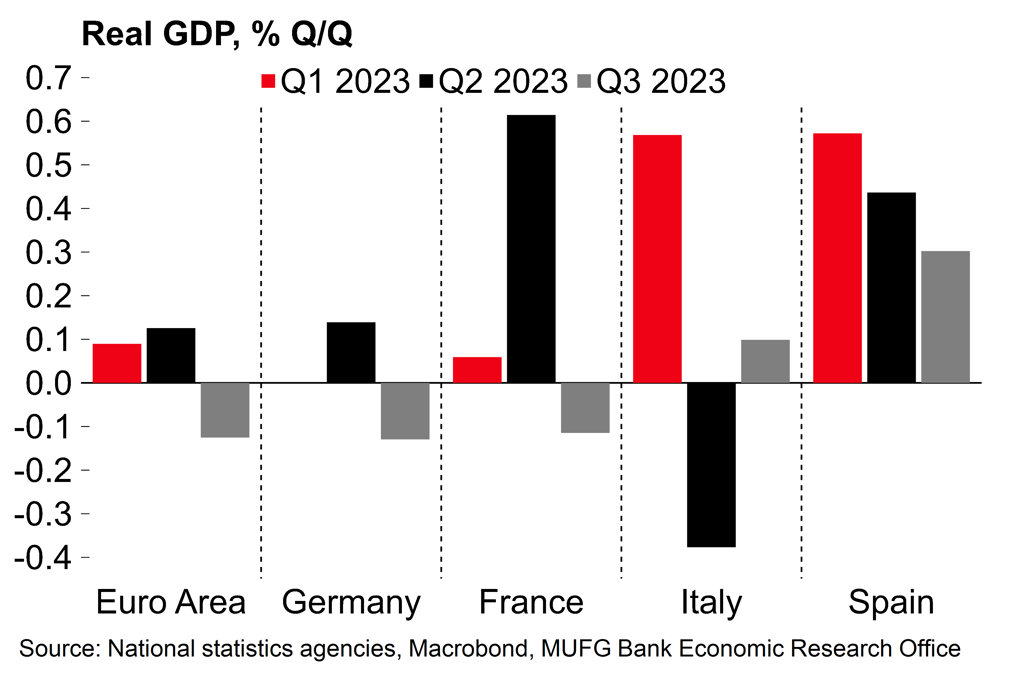 We are tracking euro area growth at -0.1% Q/Q, which would confirm the economy slipped into a technical recession (albeit by the slimmest of margins) after the same figure in Q3. The German statistical office has already suggested that the German economy contracted by 0.3% Q/Q when it released its early estimate of 2023 annual growth. We look for better growth momentum in peripheral countries such as Spain, but not to the extent that a contraction for the euro area as a whole is avoided. Meanwhile, euro area inflation is likely to have resumed its downward path after the blip in December.
