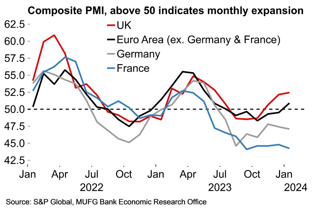 - Survey evidence continues to paint a picture of stabilising activity at the start of 2024 but there are hints of some potential for cyclical improvement in the months ahead. The outlook for the UK and non-core euro area members looks brighter, while the German economy continues to struggle.