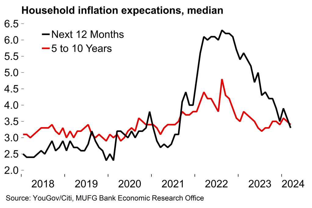 Some caution is understandable with nominal pay growth still uncomfortably high from a monetary policy perspective at around 6% Y/Y. The domestic growth environment has also improved since the turn of the year with Q1 GDP growth set to exceed the BoE’s February projection of 0.1% Q/Q (see below for our comment on next week’s release). However, to our minds, the slightly higher-than-expected numbers on inflation and pay should be kept in perspective: the longer-term trend of disinflation remains intact and wage growth is a lagging indicator. Household inflation expectations also remain well-anchored. Current market pricing is for around two rate cuts this year. We think there is scope for more if policymakers start the ball rolling in June or August as we currently expect.
