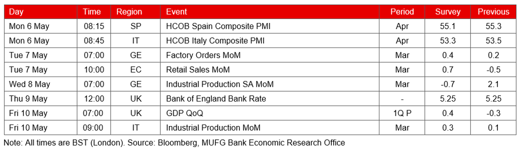 - Next week UK Q1 GDP will be released. Higher frequency data has already shown that the UK recession in H2 2023 was mild and short-lived. As is the case with the euro area it is likely that the UK economy has turned a corner at the start of the year.