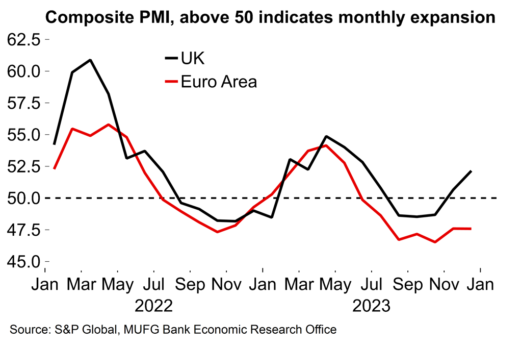 - The latest PMI figures suggest slightly stronger momentum into 2024 but the immediate outlook remains tough with the euro area on the verge of a technical recession. The picture for the UK looks slightly better, though a mild recession remains very plausible. After a challenging start to the year we expect activity in both economies will pick up as households’ real purchasing power continues to recover and central banks shift into easing mode.