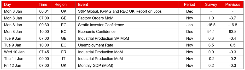 Next week, national industrial production data and German factory orders will provide a gauge of the strength of the euro area manufacturing sector in November. Weak figures would harden expectations for a euro area recession in Q4 after the Q3 contraction. There will also be a first look at sentiment in 2024 with the Sentix index for January.