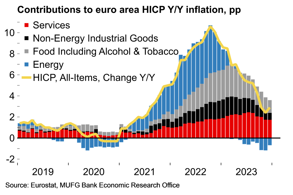Euro area inflation picked up from 2.4% in November to 2.9% in December (Chart 1). This was largely due to base effects related to German government support for household energy bills in late 2022. German headline inflation rose to 3.8% (from 2.3% in November). The ECB had flagged the risk that inflation could “pick up again temporarily in the near term” due to these energy base effects and indeed the headline December HICP figure is in line with the ECB’s latest projections (Chart 2).