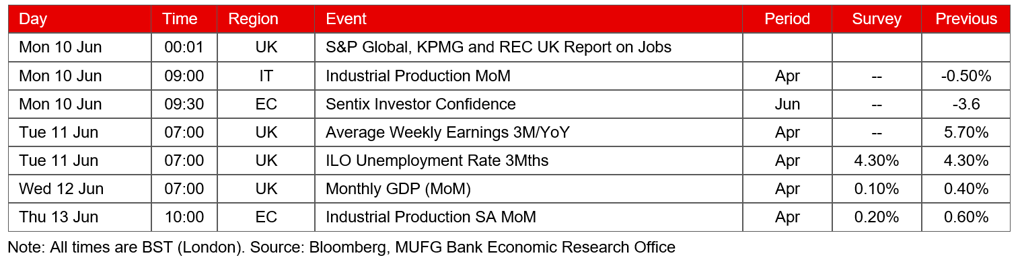 The focus shifts to the UK economy next week with a range of data on the labour market and activity to be released. The official pay growth numbers could look quite sticky, with the April figures encompassing the 10% increase in the minimum wage that month. However, there are still concerns about the quality of the Labour Force Survey (the BoE noted rather pointedly that pay growth figures have “tended to be volatile” at its May meeting) which means there is extra attention paid to survey data. Next week will also see the release of the REC report on jobs, which the BoE has often cited in the past and could go some way to mitigate any concerns about sticky official pay growth figures. The latest BoE DMP survey (here) for May pointed to easing pay pressures, with the three-month average rate for expected year-ahead wage growth falling 0.3pp to 4.5%. These figures support our view that the UK disinflation trend remains on track. There were no signs of an acceleration in inflationary pressures with stable 1-year CPI inflation expectations and slightly lower output price expectations.