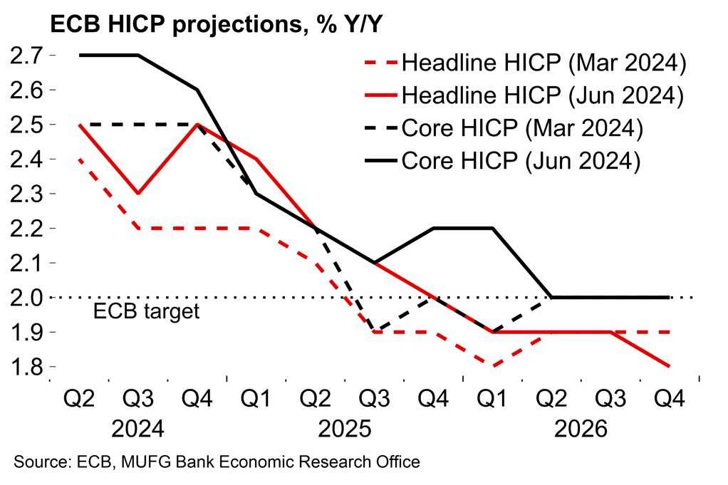 - The ECB followed through with its well-signposted June cut, despite raising its inflation forecasts amid signs of persistent wage pressures. A back-to-back cut at the next meeting in July does not look on the cards with data out today showing that growth in compensation per employee accelerated in Q1. Further ahead the ECB will want to preserve flexibility and has no intention to set out any pre-defined path for future easing at this stage, with an emphasis that moves will be data-dependent. Nonetheless our view remains that the euro area disinflation process is set to reassert itself in the second half of the year and we suspect that the ECB’s inflation projections could be revised lower in September, clearing the path for further easing in 2024.