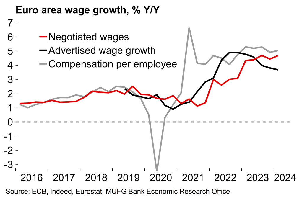 This was a projection meeting and the ECB increased its inflation numbers in 2024 (headline: 2.5% from 2.3% previously, core: 2.8% from 2.6% previously). The 2025 headline number was also increased, from 2.0% to 2.2%. This was driven by expectations for stickier wage growth – the rate for compensation per employee, the ECB’s preferred measure, was revised up by 0.3pp to 4.8% in 2024. We suspect that the ECB may have had advance sight of the Q1 figures which were released today – the numbers were not good from a monetary policy perspective, with a 5.1% Y/Y increase in Q1, up from 4.8% in Q4 2023.