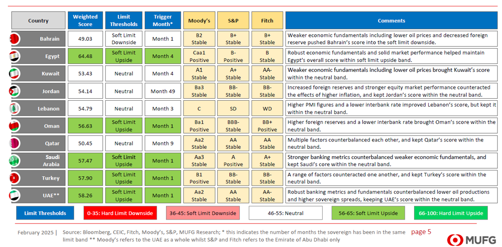 - UAE. Pivot from the “neutral band” into the “soft limit upside band”. Sound economic fundamentals and robust market performance lifted the score.
