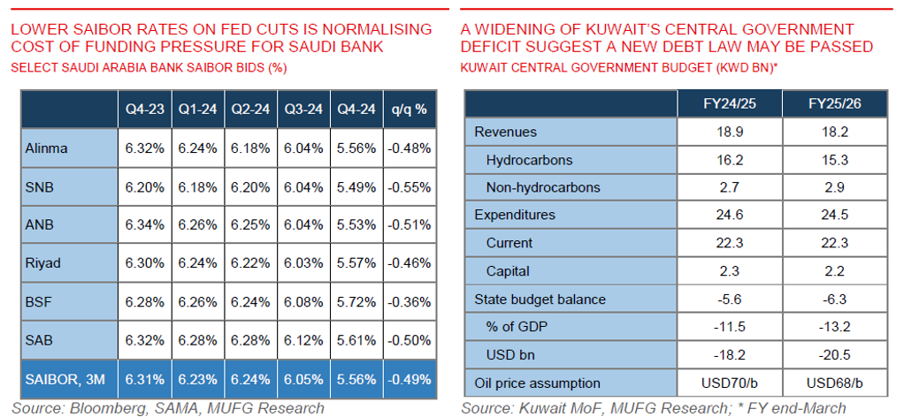 Kuwait’s wide government in FY25/26 calls for a new debt law. The draft Kuwait budget for the fiscal year 25/26 (commencing April) foresees a central government deficit of KWD6.3bn (USD20.5bn). Authorities expect the deficit to widen compared to planned FY24/25 budget deficit for KWD5.6bn (USD18.1bn). The deterioration is related to lower oil revenues as authorities assume production unchanged and price averaging at USD68/b in the fiscal year (USD70/b assumption in FY24/25). Non-oil revenues are expected to increase and expenditures to remain flat owing to spending consolidation, although full details are yet to be published. According to the Minister of Finance, HE Dr. Al-Fassam, has stated that the country is preparing to return to international debt markets soon with a passage of a new debt law being discussed. As it stands, only one Eurobond (due in 2027) remains outstanding with very little local debt as well. We expect the new law would allow a return to the market, with articles pointing to a limit set as high as KWD20bn (USD65bn) over 50 years.