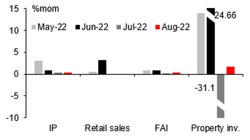 A pickup in year-over-year growth of industrial production this August. IP grew 4.2%yoy in August, up from a 3.8%yoy in July, due to stronger activities in manufacturing and electricity, heat, gas & water production and supply sector. Specifically, growth of value-added in manufacturing edged up to 3.1%yoy from prior’s 2.7%yoy, with automobile production backed by a reduction in a levy on auto purchases growing by 30.5%yoy in August after a 22.5%yoy increase in July, and growth of electricity, heat, gas & water production and supply accelerating to 13.6%yoy in August from 9.5%yoy in July, the biggest gain since March 2021. In contrast, growth of mining production slowed to 5.3%yoy in August from 8.1%yoy in July. Ownership-wise, growths of value-added in state-owned and foreign firms rose to 5.6%y and 4.0%yoy respectively, from 5.4%yoy and 1.9%yoy in July, while growths of value-added in private and share-holding enterprises slowed to 1.1%yoy and 4.1%yoy respectively, from 1.5%yoy and 4.4%yoy in July. That said, in sequential terms, IP growth slowed marginally to 0.32%mom in August from previous 0.38%mom.