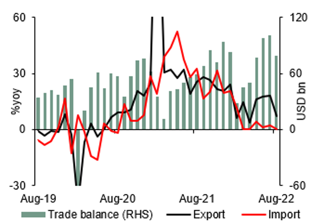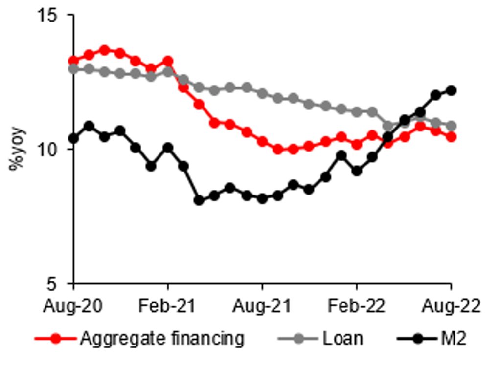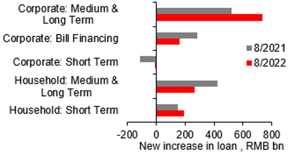 The rebound in corporate medium and long-term loans suggests signs of improvement in China’s credit structure, but housing demand for mortgage remained weak. Loan stock growth edged down to 10.9%yoy this August from 11.0%yoy in the prior month. The new increased loan was RMB1.25 trillion, RMB30 billion higher than last August, with overall (household and corporate combined) new increased short-term & billing financing and medium- & long-term financing being RMB23.2 billion and RMB53.7billion higher than the level in August 2021 respectively. While corporate medium & long -term loan showing improvement, with new increase being RMB213.8 billion higher than last August, new increase household medium & long-term loan was RMB160.1 billion lower than last August, reflecting demand for mortgages was still low.