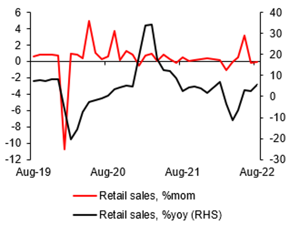 Retail sales remained weak in August. Retail sales growth rose to 5.4%yoy in August from 2.7%yoy in July, with commodity retail growth accelerating 1.9ppts to 5.1%yoy and catering expanding 8.4%yoy after a 1.5%yoy decline in the prior month and ending a five-month run of y-o-y contractions. However, in a month-on-month basis, retail sales contracted 0.05%mom after -0.12%mom in July.