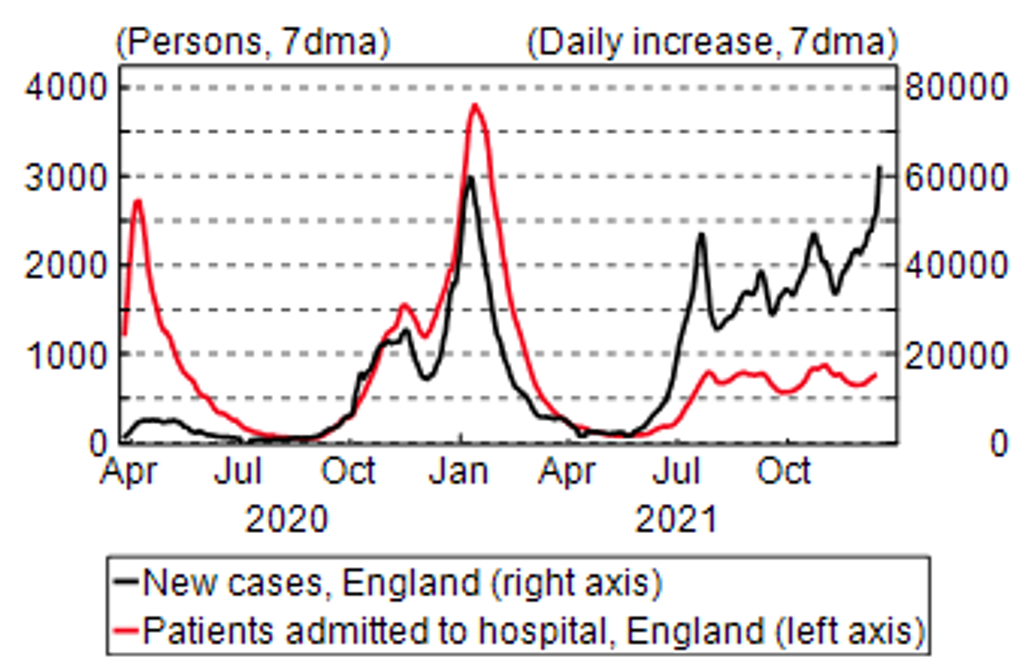 The move can be justified but it certainly seems a brave call from the Bank of England to raise rates a day after the country’s COVID caseload reached a record high. The MPC itself noted that the spread of the Omicron variant would “unambiguously slow economic activity”. So far, the UK government, which is facing various political pressures, has shown its reluctance to tighten restrictions beyond guidance on mask wearing and working from home. The number of hospitalisations remains the key driver for any further lockdown measures. Despite good vaccination coverage, admissions could certainly rise given the apparent transmissibility of the new variant even if it does prove to be more benign than Delta. Higher caseloads may also mean higher staff absence which could put the healthcare system under extra strain this winter. To our minds it would be no surprise to see further restrictions implemented after Christmas.