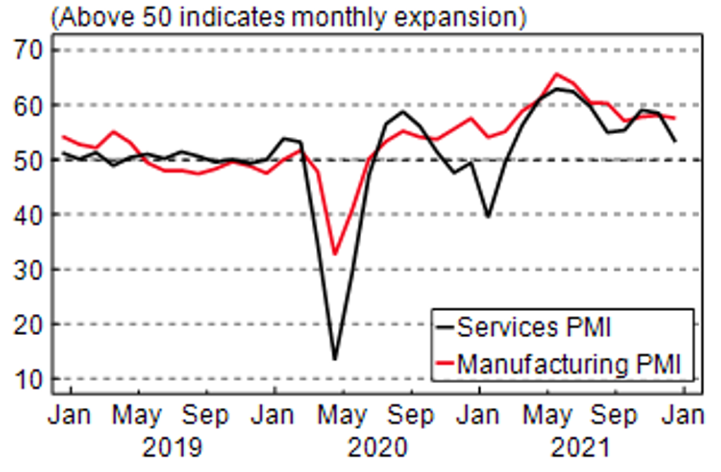 At the same time, the emergence of Omicron could lead to higher inflation for longer. Global supply bottlenecks had been showing some signs of easing but these could increase again if Omicron leads to factory closures and worker absence. There could also be a rotation from services consumption (such as bars and restaurants) back towards goods, which are more sensitive to supply-chain problems and have shown considerably higher rates of inflation in recent months.