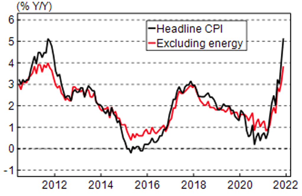 The IMF also suggested that “careful communication would be needed to lay the groundwork with markets for potentially more frequent policy moves”. But even if the added Omicron uncertainty were to quickly clear, it seems fair to question whether rate normalisation will be smooth and predictable after two consecutive surprises from the BoE (one MPC member said only two weeks ago that it was “premature” to talk about rate hikes but then voted to hike yesterday). As yet there hasn’t been much guidance about the extent of a rate hike cycle. It is plausible that the BoE could hike again in short order to 0.50%, the point at which passive balance sheet reduction would come into play, before moving to a “wait-and-see” stance. Inflation could then normalise quite quickly in H2 2022 if supply congestion clears and reinforces downward pressure on headline CPI from base effects and reduce the scope for further moves.