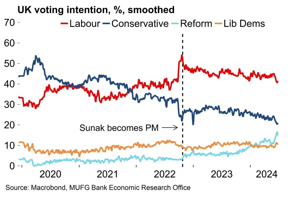 The Labour party remains on course to win the UK general election on 4 July, and win it comfortably. When Sunak, the UK PM, took the surprise decision to call the vote last month we suggested that his Conservative party’s polling deficit could narrow slightly (see here). That has not been the case. The Conservatives have suffered from numerous campaign missteps and the rise in support for the right-wing populist Reform UK party since Nigel Farage, the architect of Brexit, entered the contest as a candidate. Labour have consistently led the polls since late 2021 and by-election and local election results have provided no reason to question the accuracy of this. Prediction markets now put the implied probability of a Labour majority at over 95%.